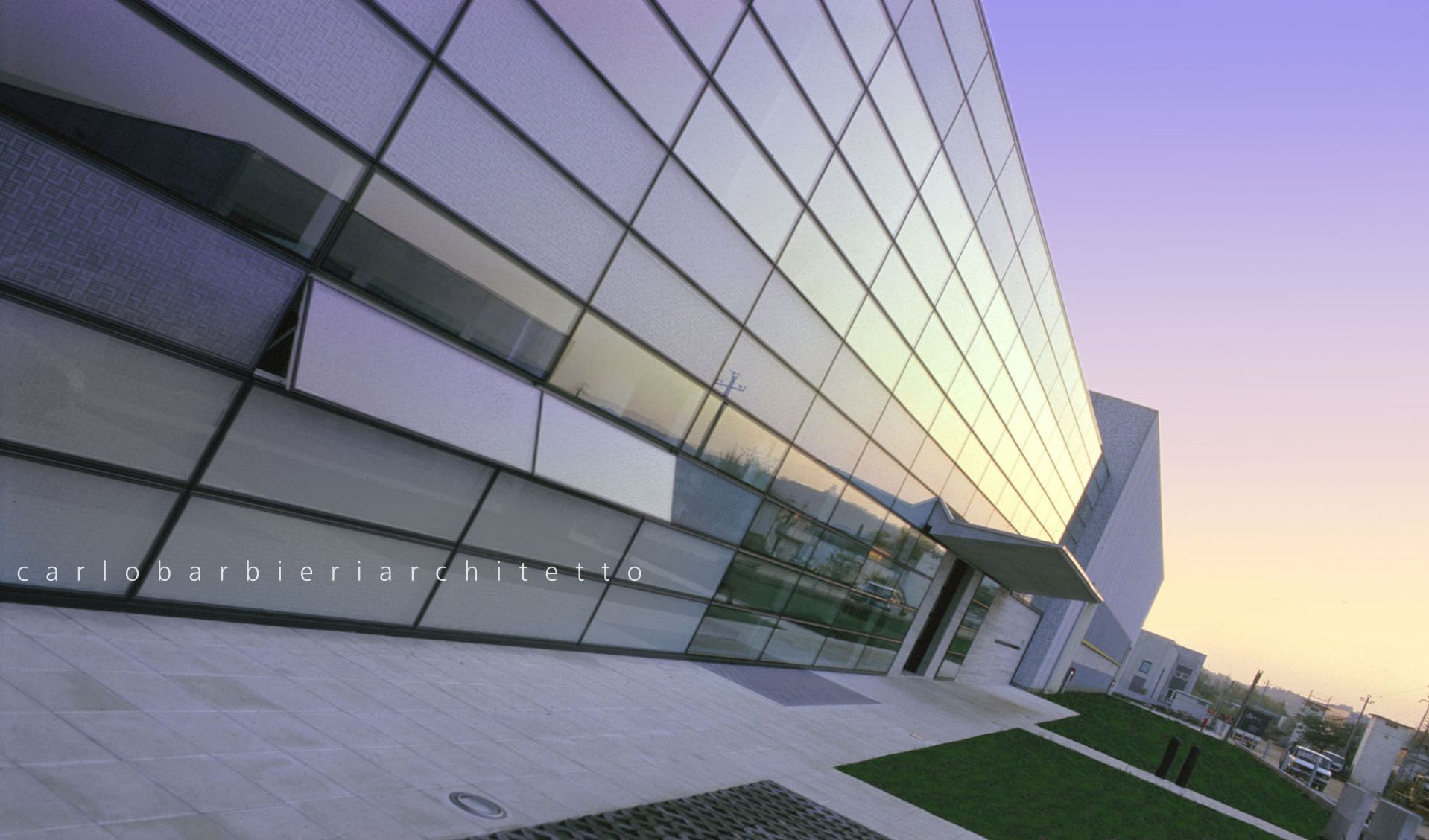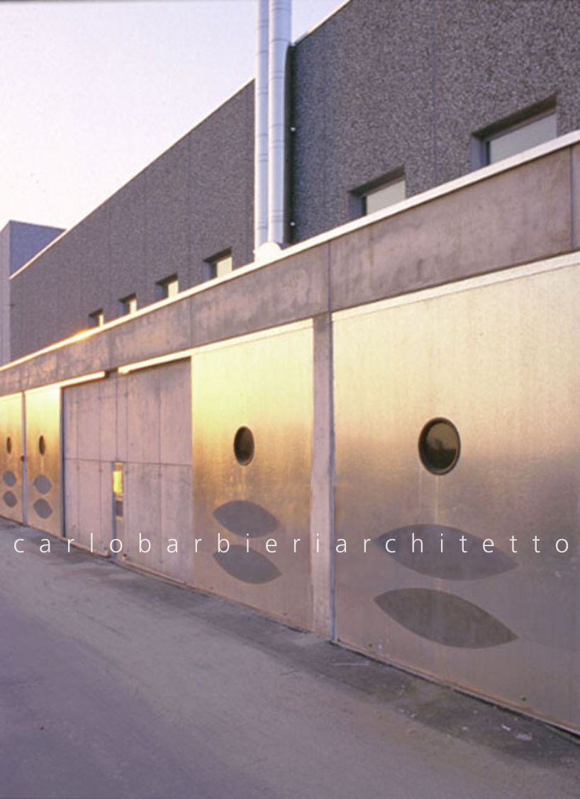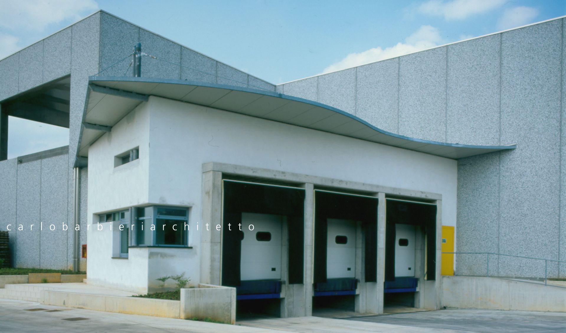 The structure is organized into three distinct volumes, each dedicated to a specific function: climate-controlled silos, the production area with the finished goods warehouse, and the offices with service areas strategically located at the center.