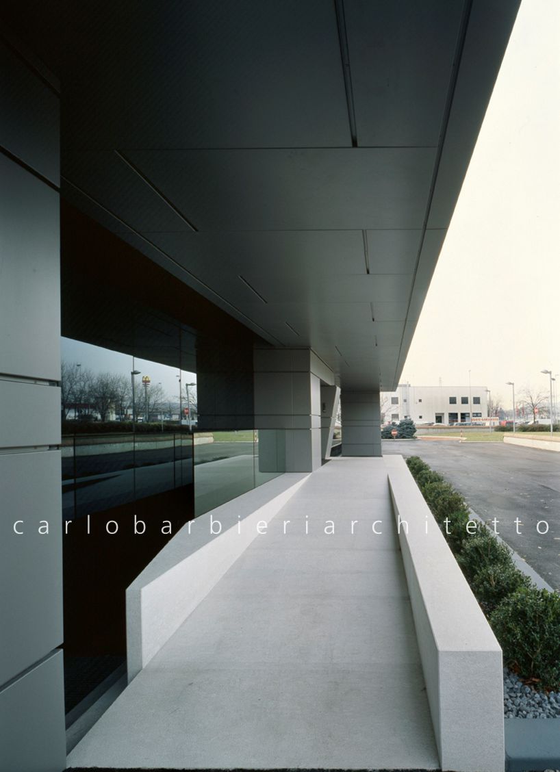 Data la differenza di quota tra interno ed esterno, l’ingresso è stato completamente ridisegnato con l’inserimento di una rampa protetta da una pensilina. Questo intervento non solo elimina le barriere architettoniche, ma diventa anche un elemento distintivo che caratterizza il fronte principale dell’edificio. Rampa, gradini e pensilina, realizzati in metallo e pietra, si integrano in un unico elemento architettonico, divenendo il simbolo visivo dell’identità aziendale sul prospetto che si affaccia sulla strada urbana.