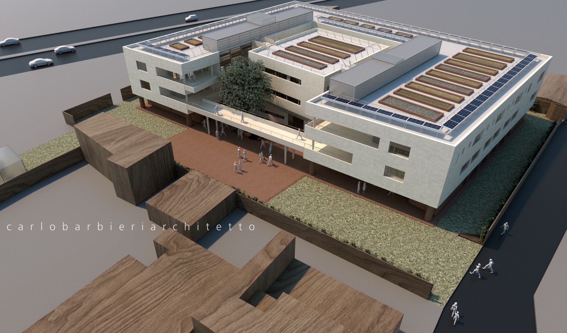 Un giardino sul tetto integra energia solare, raccolta di acqua piovana, orti, apicoltura e coltivazioni, terapia verde per la riabilitazione.